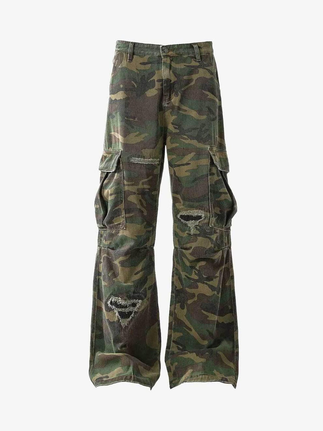 WOVEN RIPPED CAMOUFLAGE FLARED CARGO PANTS