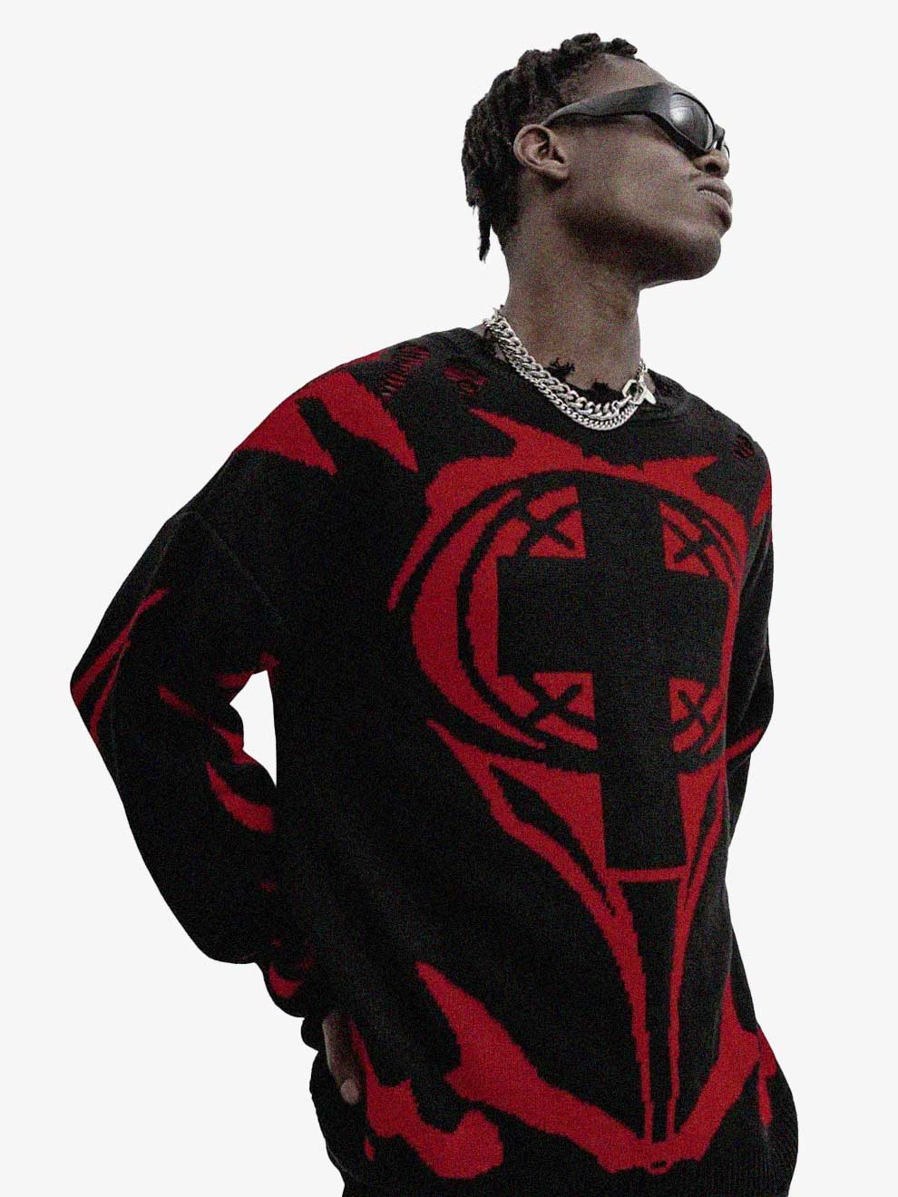 Y2K CROSS KNITTED DISTRESSED SWEATSHIRT
