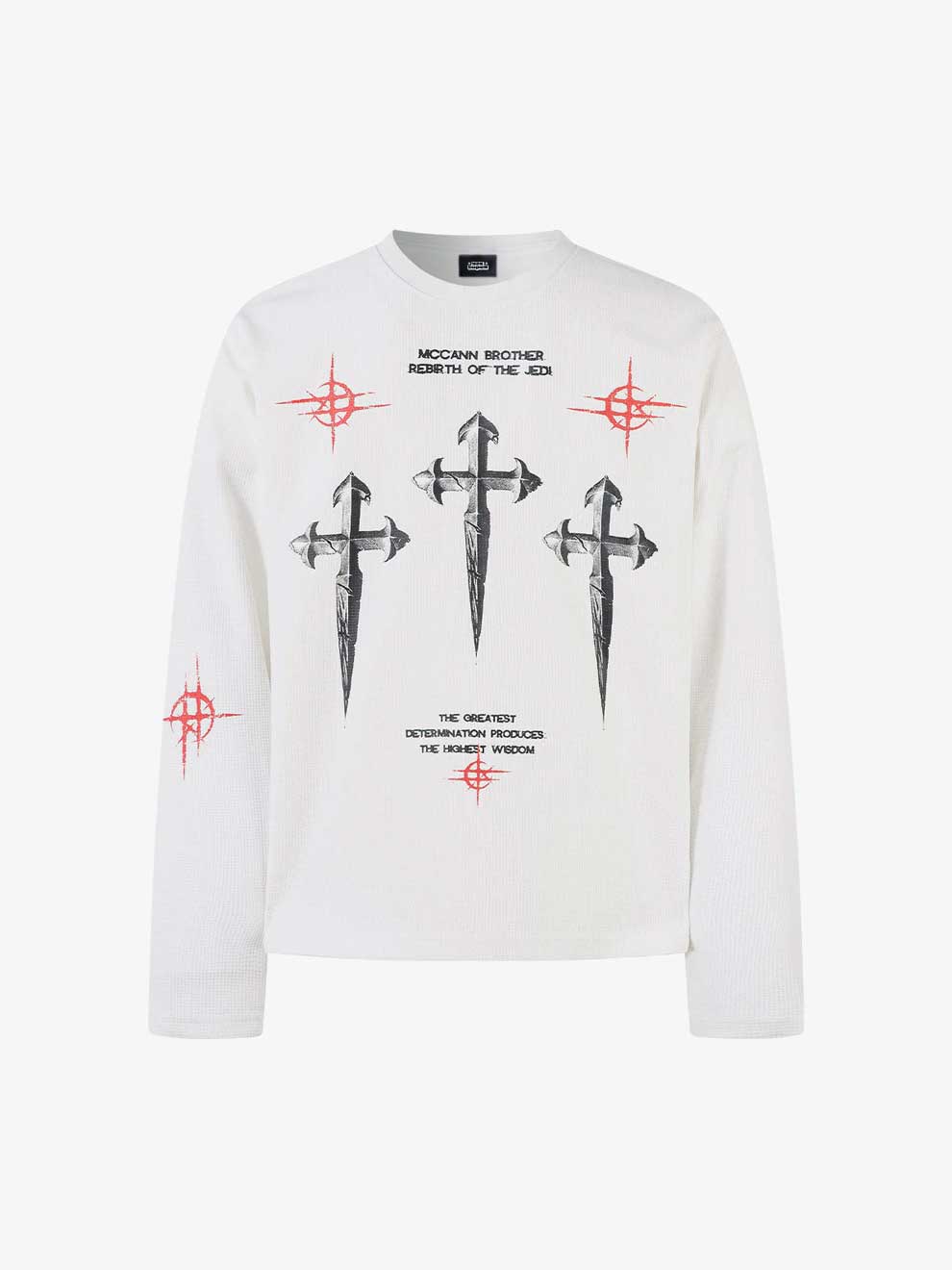 LETTER PRINT WAFFLE CROSS LONG SLEEVED T-SHIRT
