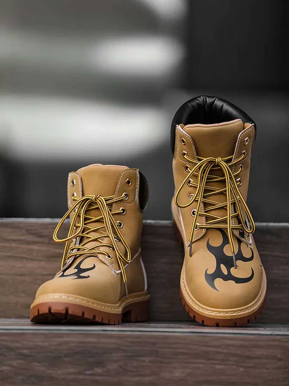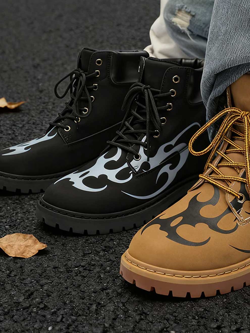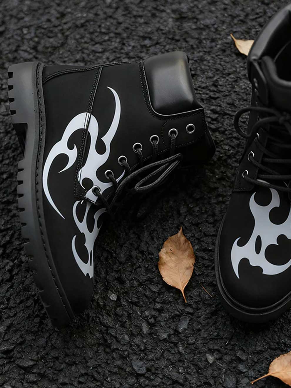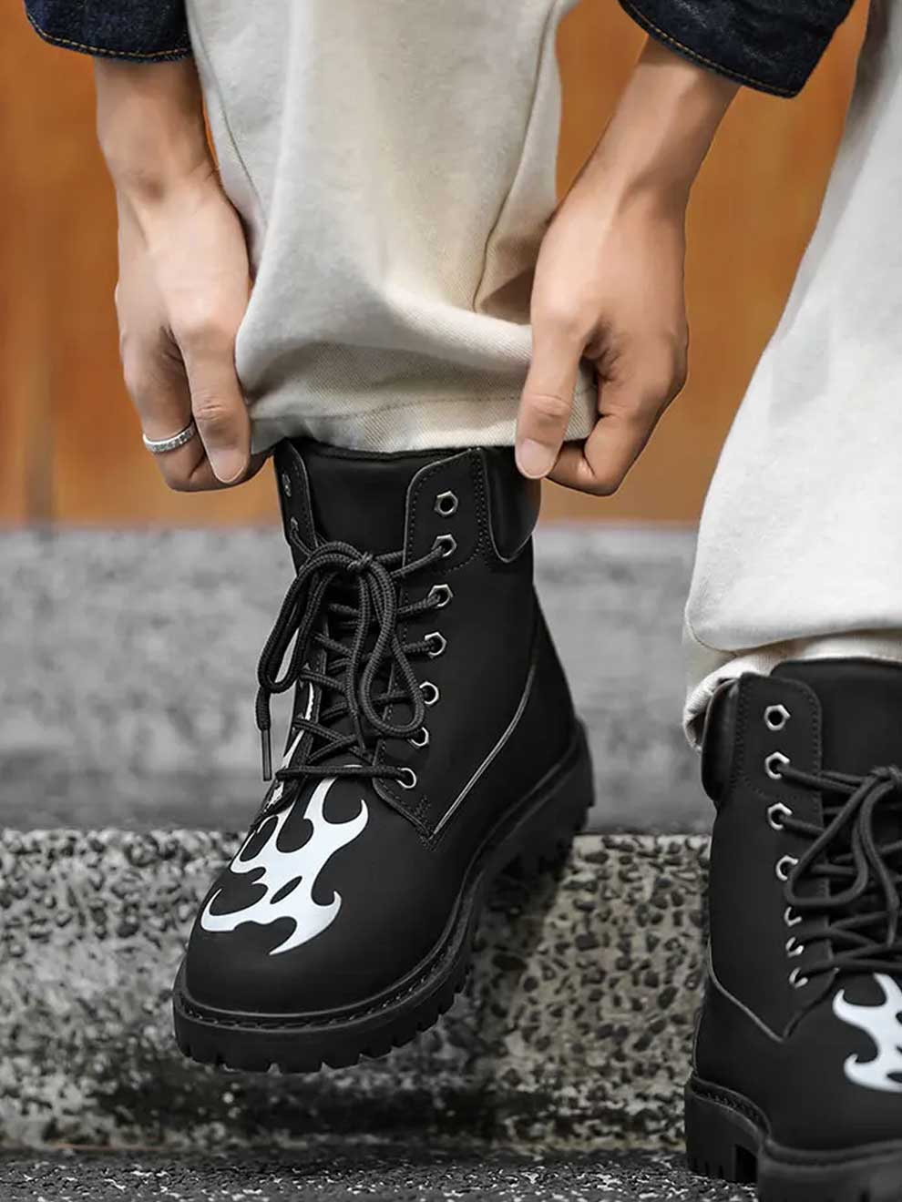 Inspired by the "no rules" attitude of modern urban fashion, these mid-calf boots feature a striking tribal flame graphic that wraps from the toe to the ankle. It’s the perfect addition to your y2k clothing collection, offering a rugged silhouette with a high-contrast aesthetic that demands attention.