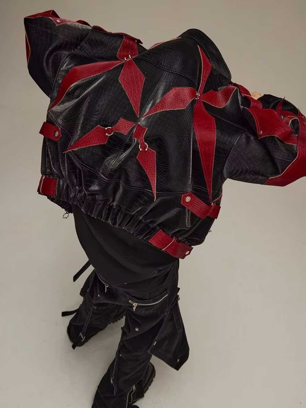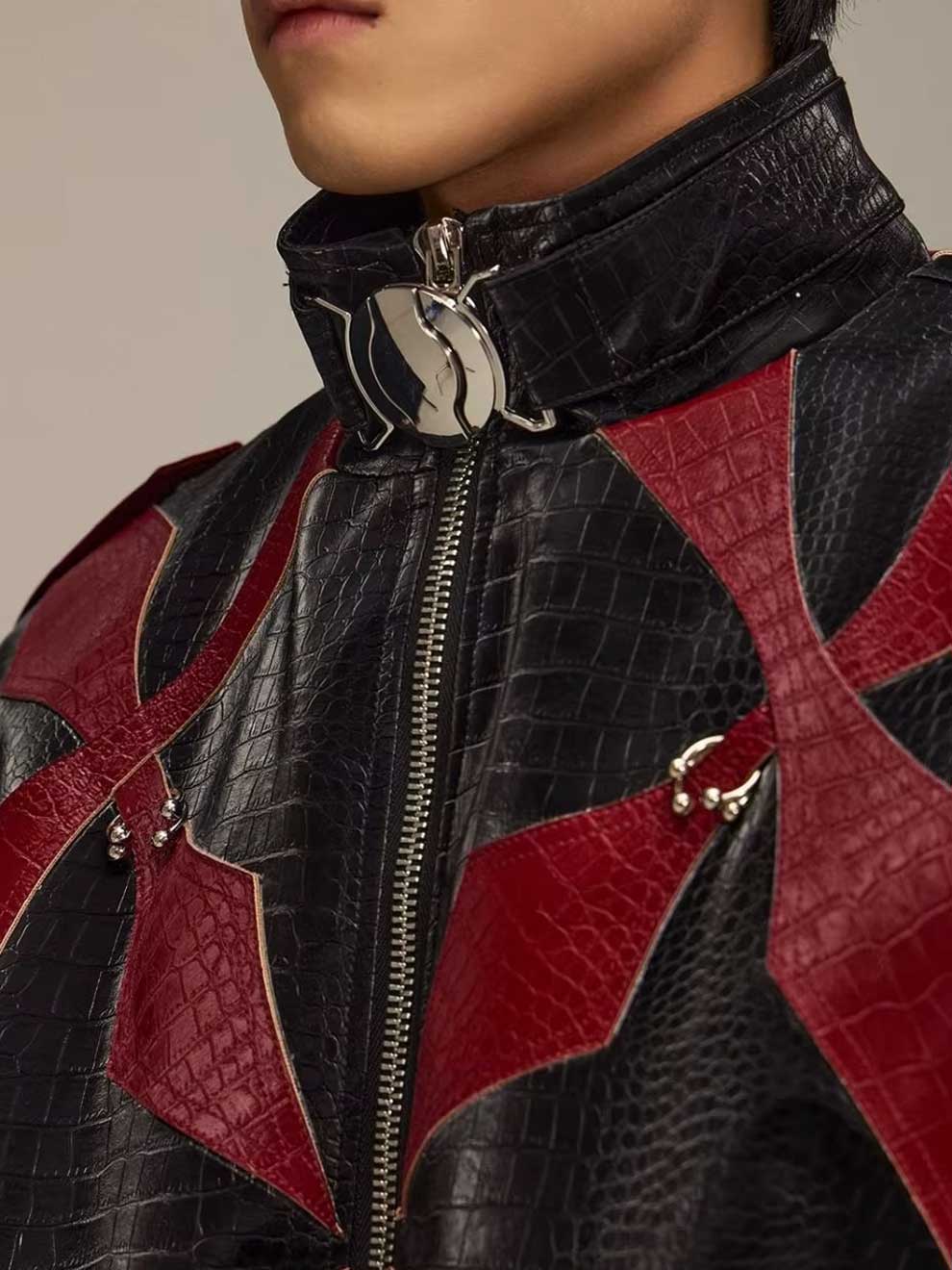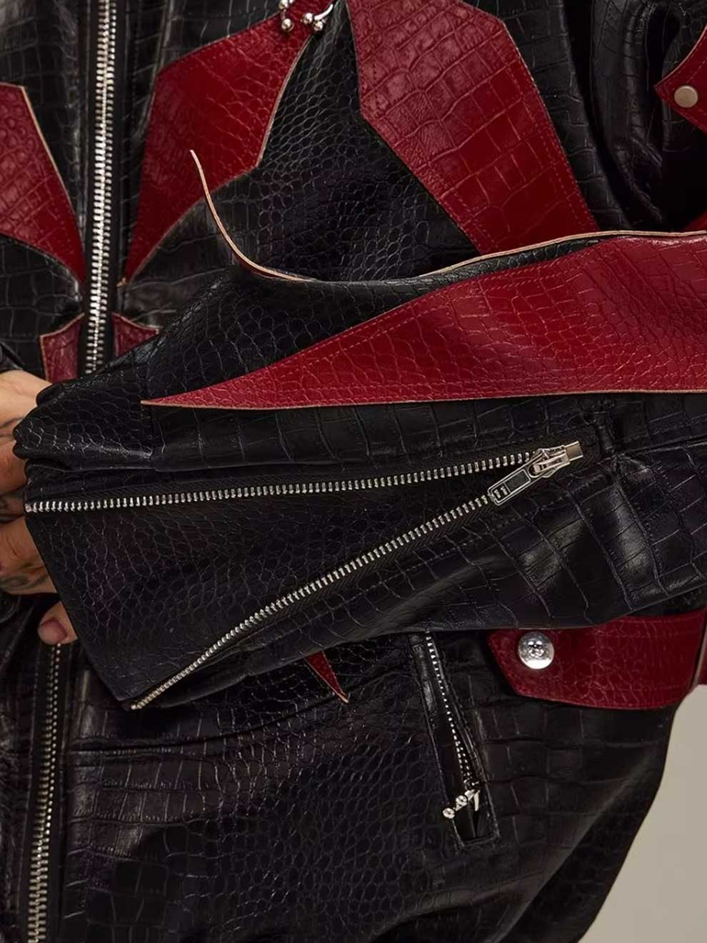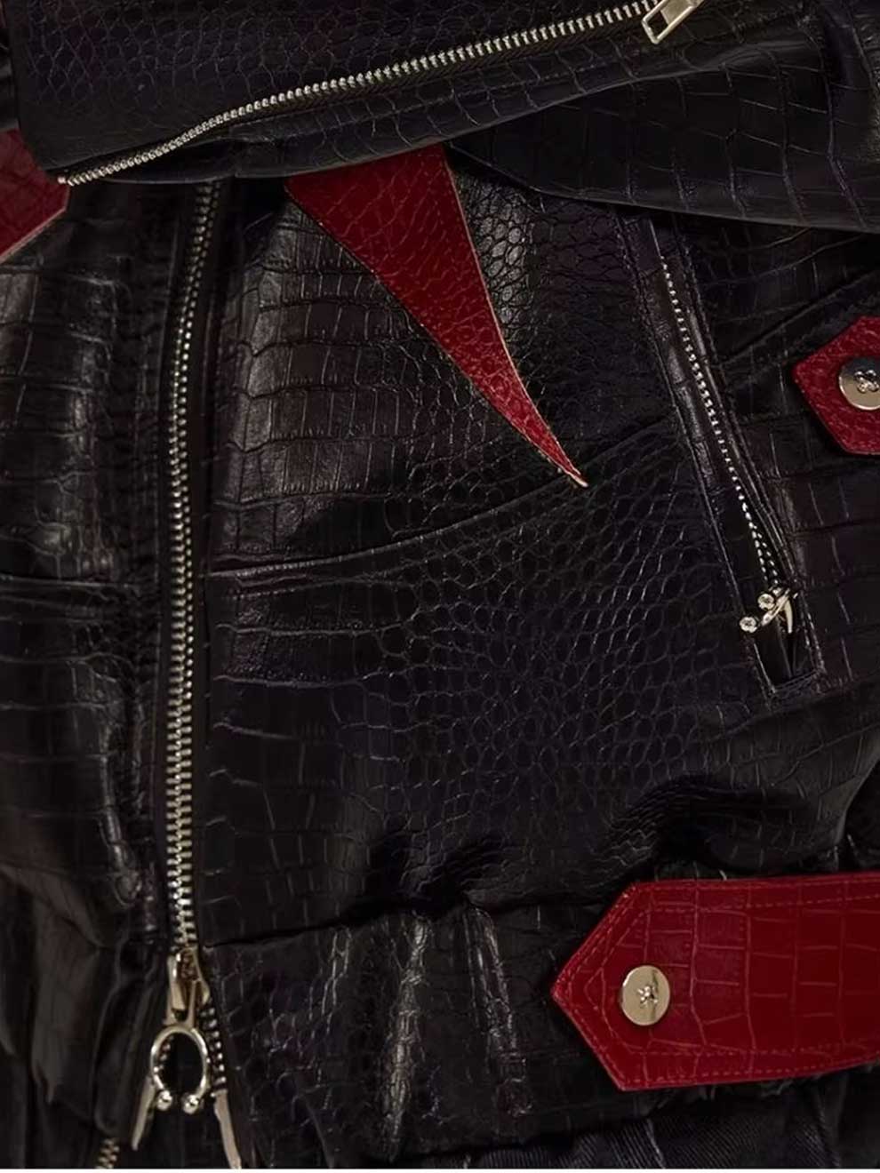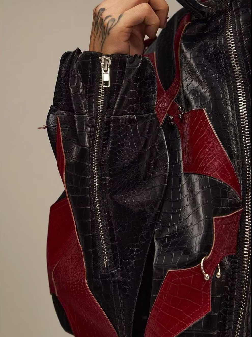 RED CROCODILE PRINT PATCHWORK BIKER LEATHER JACKET