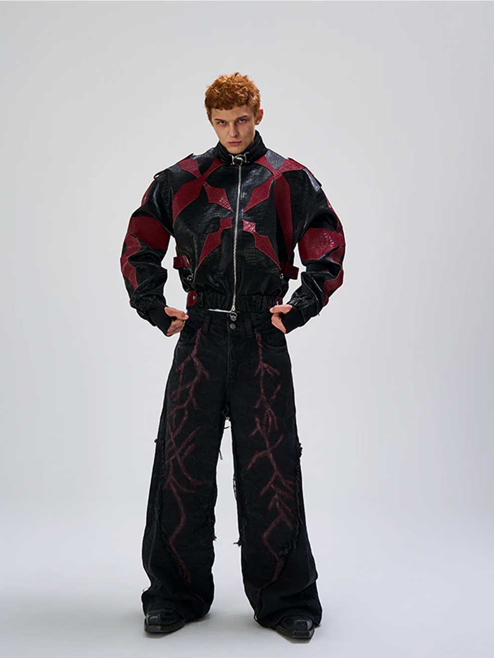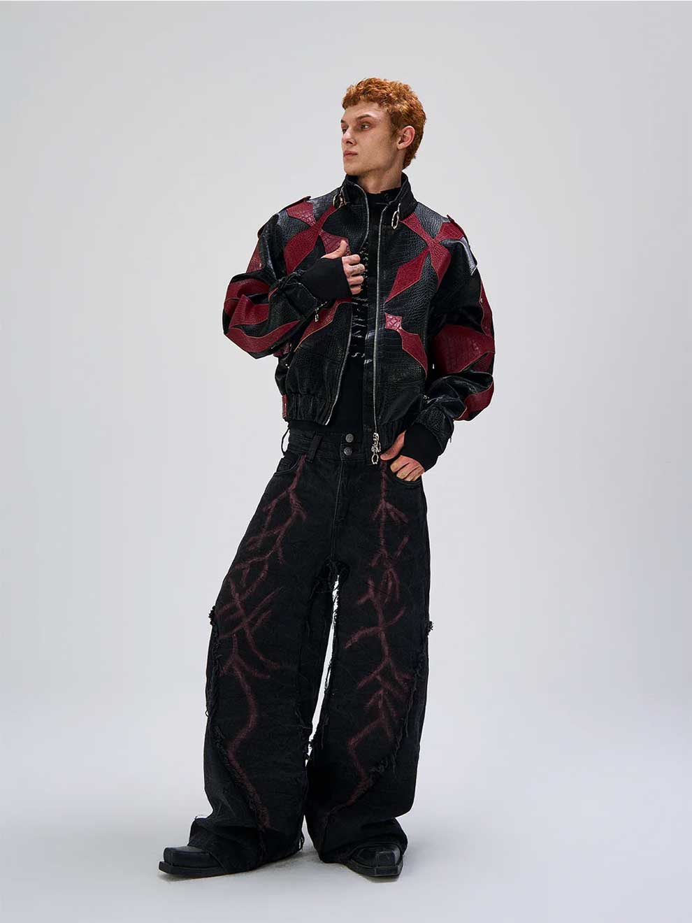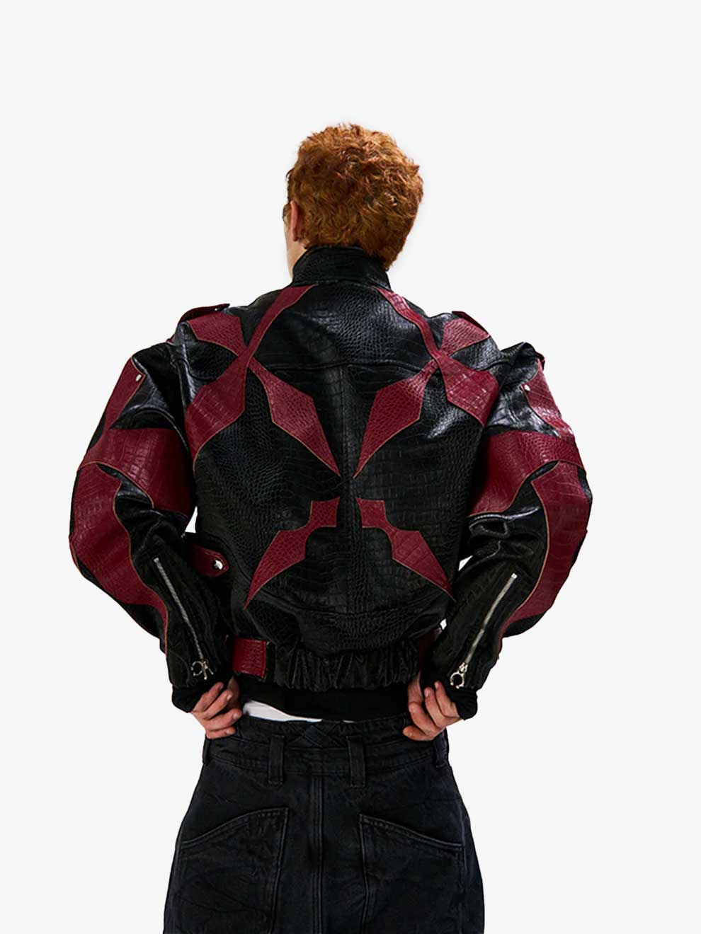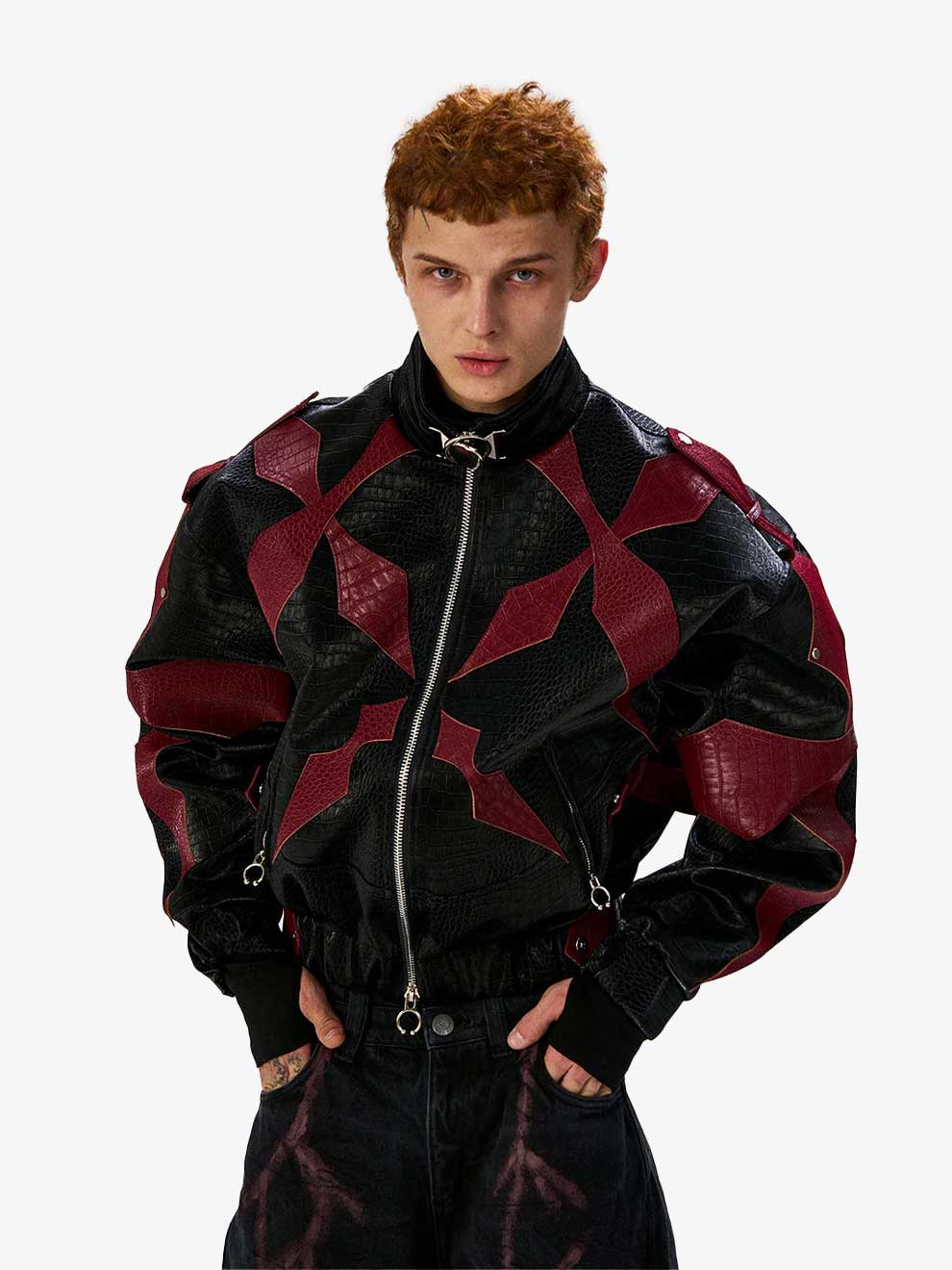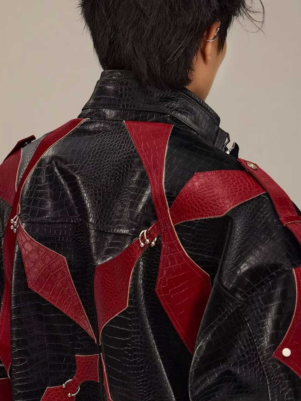 RED CROCODILE PRINT PATCHWORK BIKER LEATHER JACKET