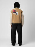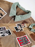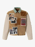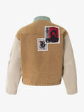 Style: Authentic Vintage and Y2K Streetwear aesthetic with bold patchwork detailing and a classic Turn-Down Collar.