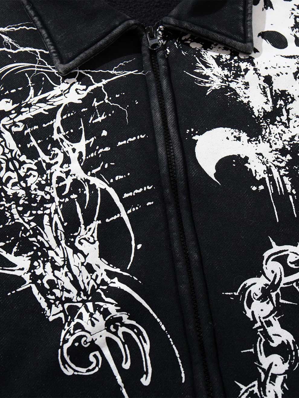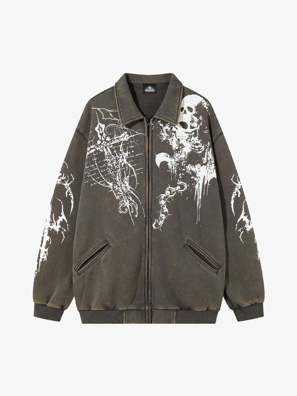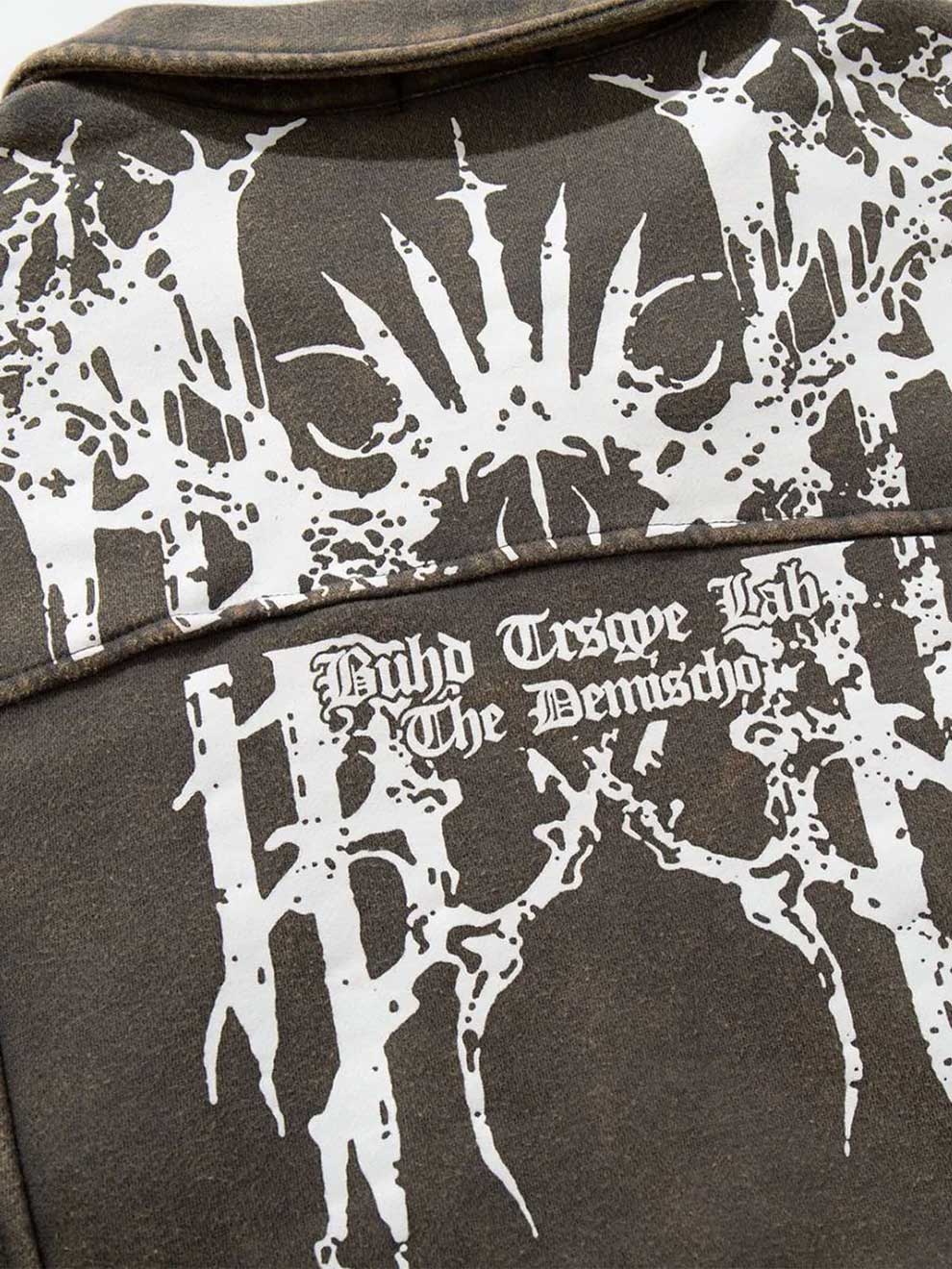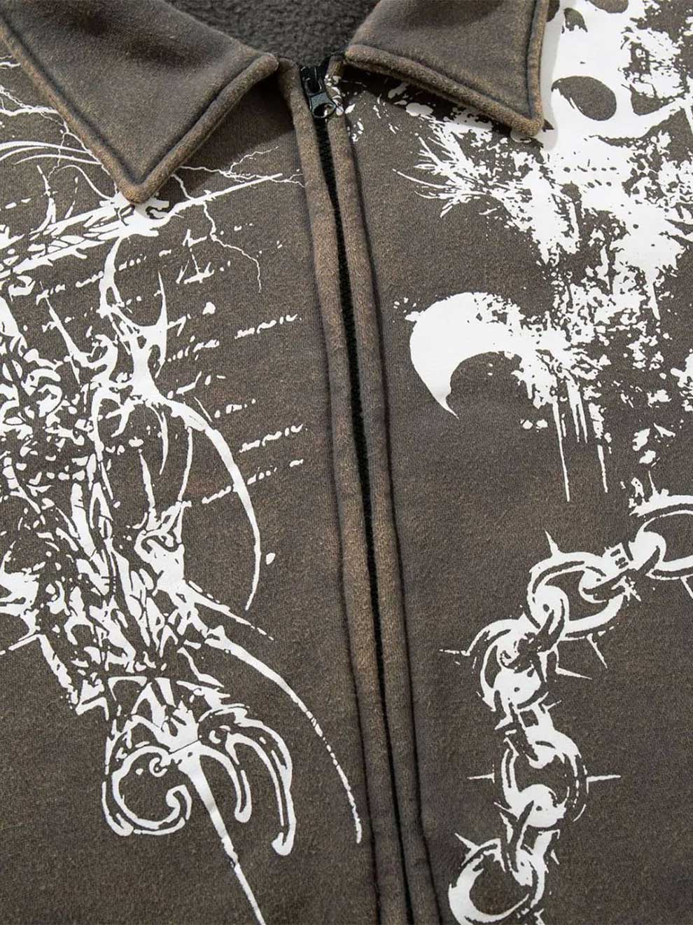 Crafted from a comfortable Polyester blend, this top features a distinctive vintage wash and an intricate, high-contrast skull and abstract print. The full-zip closure and stylish Turn-Down Collar (Lapel) give it the feel of a casual jacket, perfect for layering. Its Punk Style aesthetic and loose type fit make it the ultimate centerpiece for modern y2k streetwear. This standard-thickness jacket with full-length sleeves is ideal for Spring and Autumn daily wear.